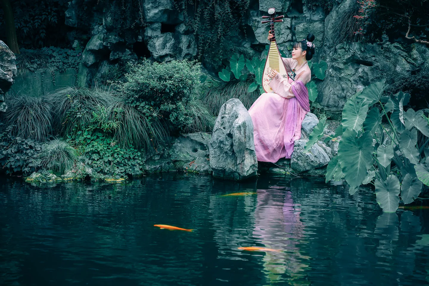 沉稳的绿,香郁的紫,透彻的潭,色调太美好了