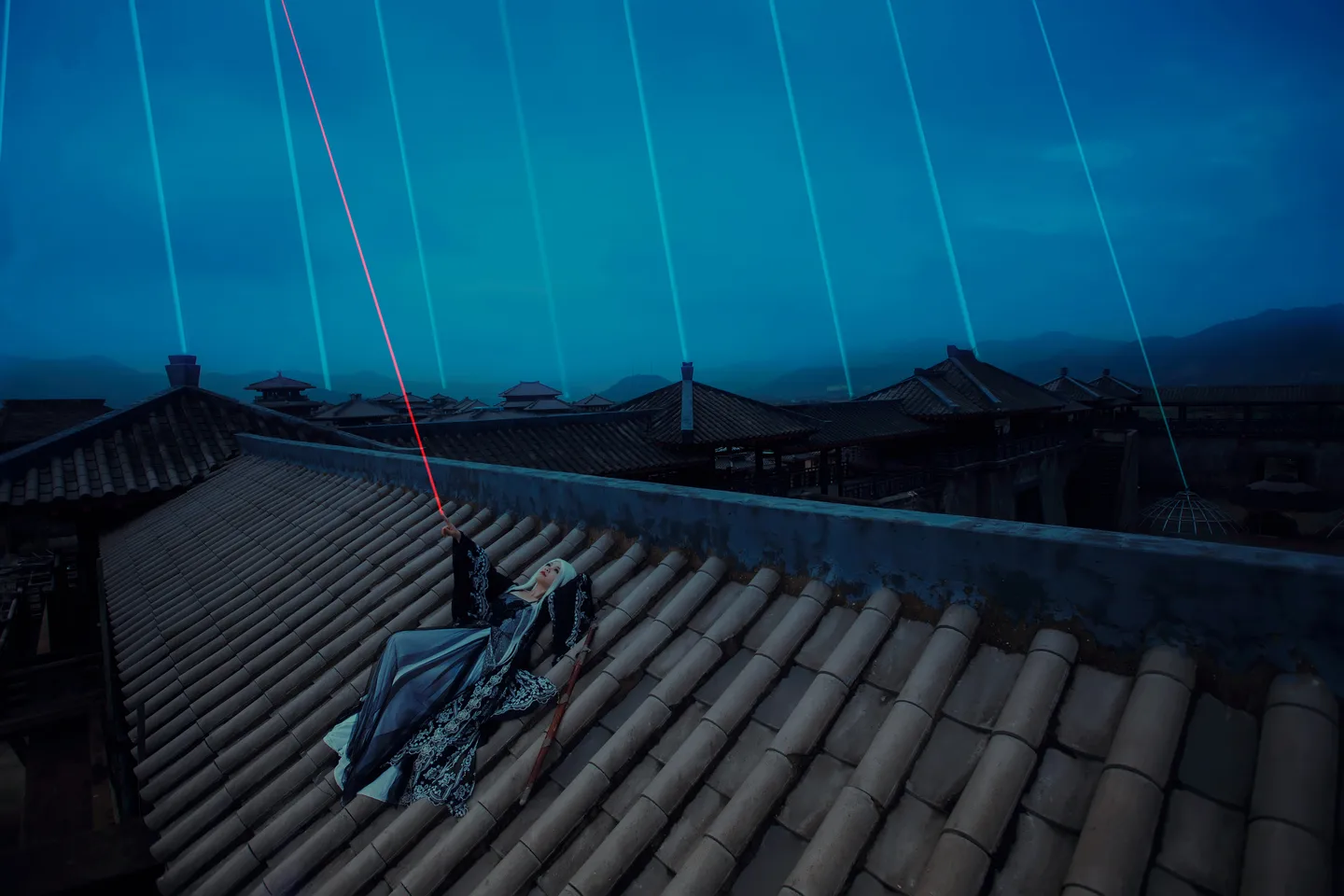 暮色中看似很慵懒的射出一指红光,却在不经意间展现了恃才傲物的玩世不恭,更在众多的蓝色光束下反衬出舍我其谁的霸气