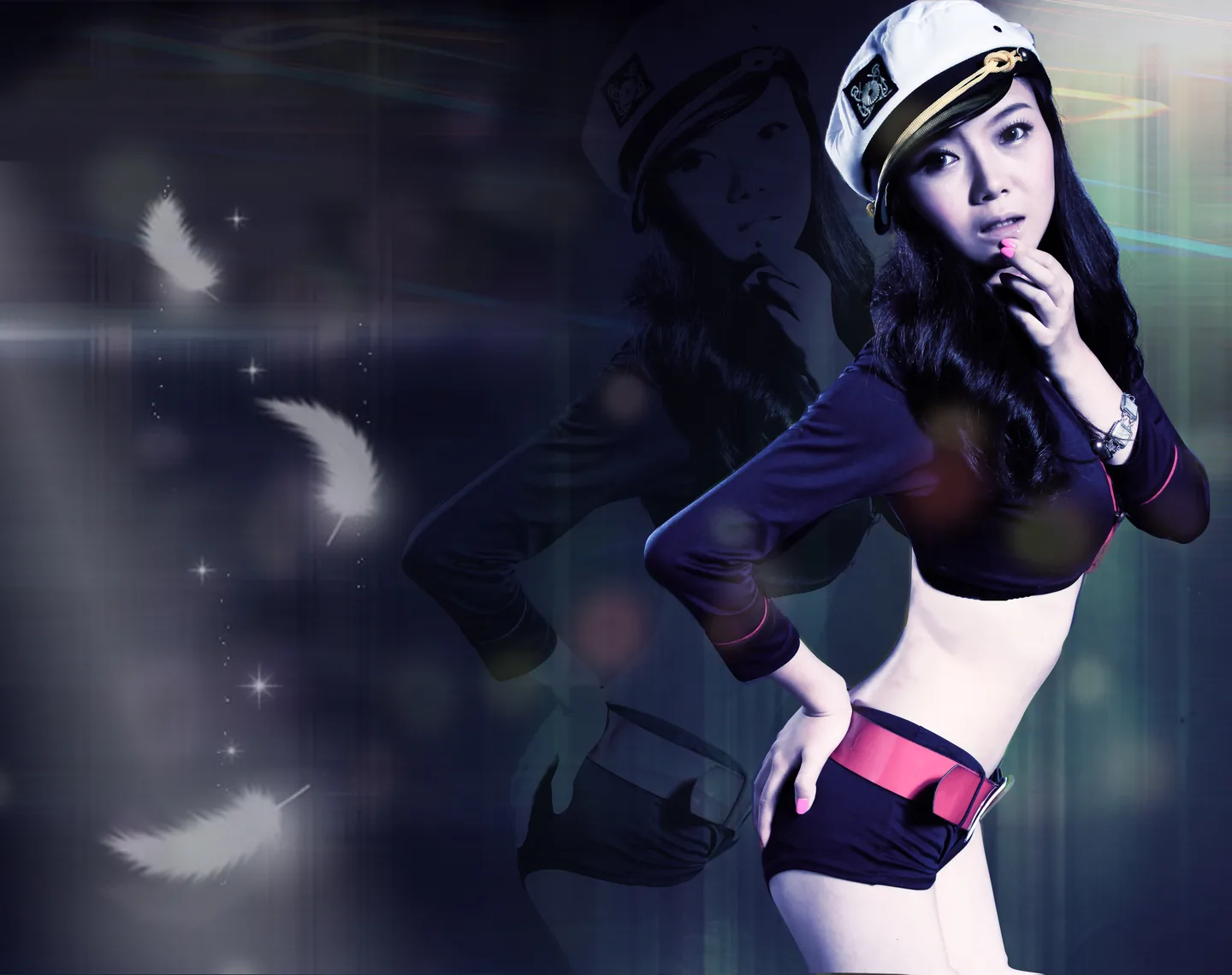 赘肉修饰掉。。腿修细些。。身材更S一些。。嘿嘿。。因为是艺术照。就轻微艺术化吧。。背景也换换吧。。反正有感觉的大师接吧。。谢谢了。嘿嘿。