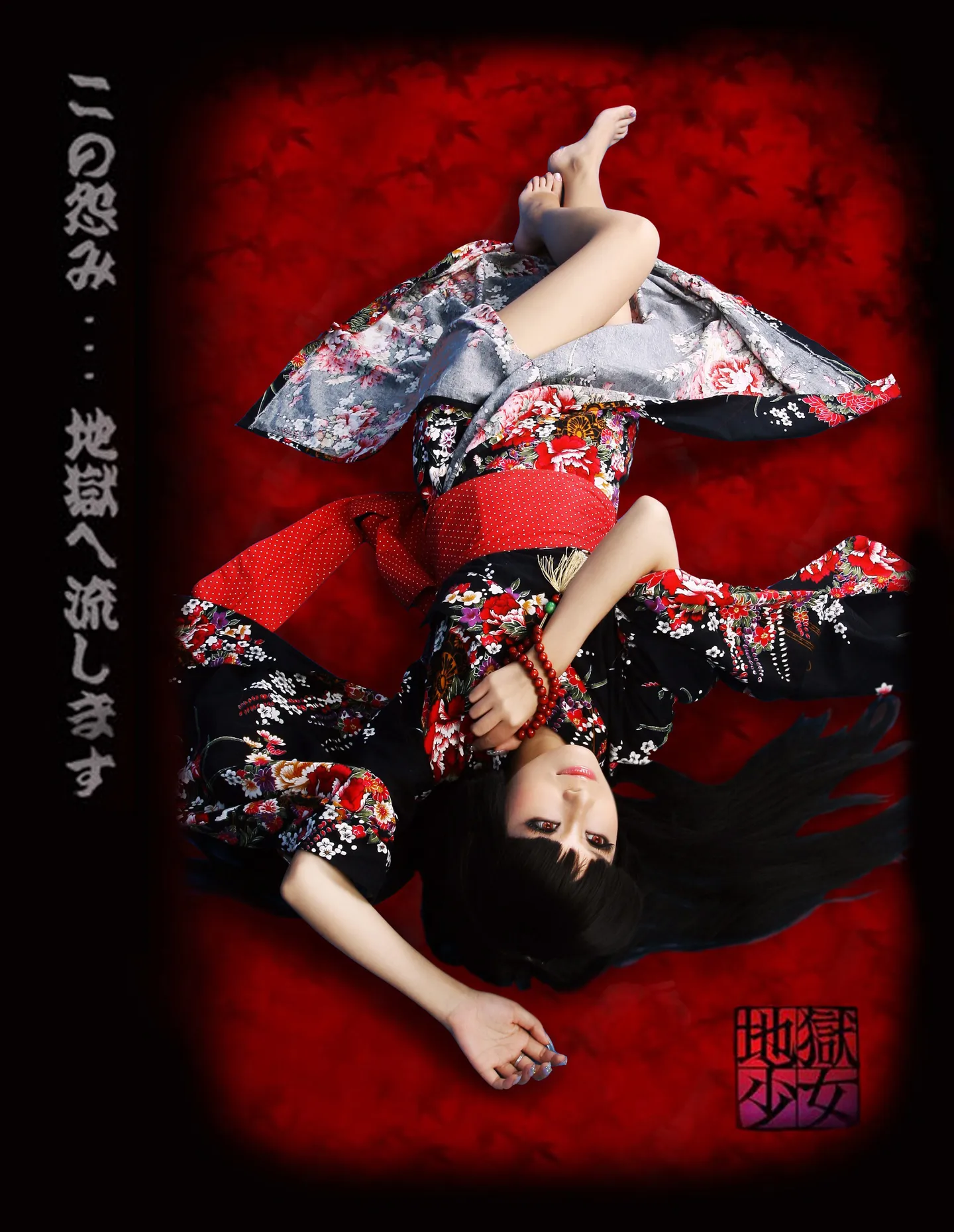 COS的地狱少女,所以,请设计背景外加眼睛变红色,美化人物脸部,有感觉的大师接哦,拜托啦。要有地狱少女的感觉哦~~~(头上有发卡,请P掉哈)