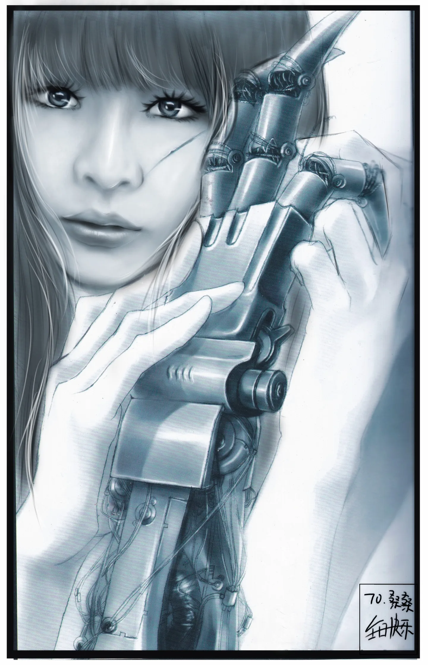 (2)与机器手相比,人物的细节还不够,用黑一点的、硬一点的画笔把鼻孔、嘴角、嘴的上下分界、下巴勾一下,把人物的关键结构表现出来。