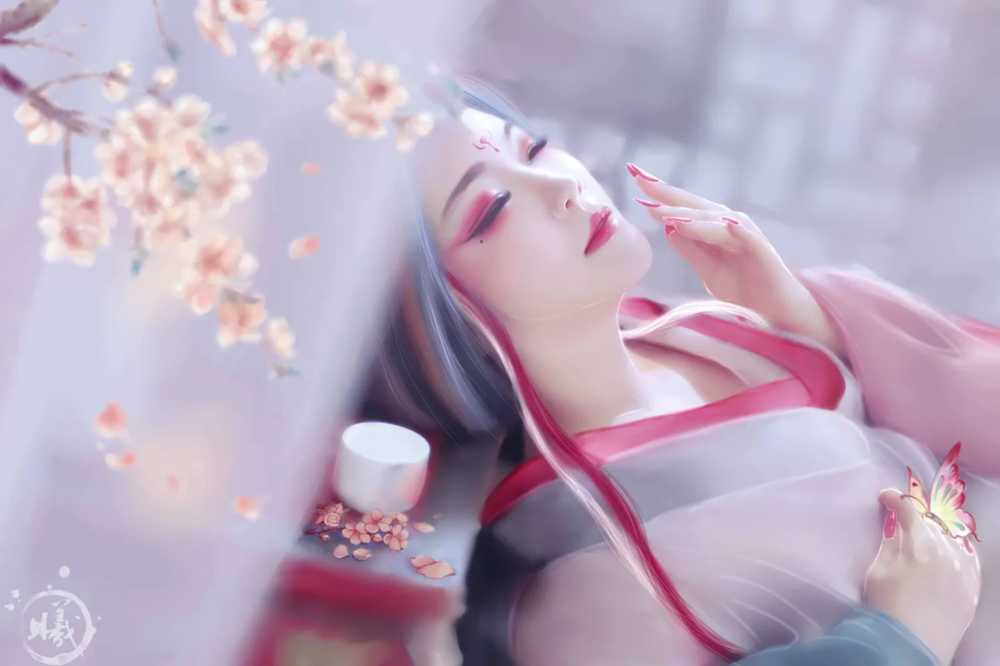 喜欢这美美的眼睛嘴唇鼻子~喜欢那从毛糙变得顺滑的发丝~喜欢新的花钿~喜欢变纤长的手指和指甲~喜欢爪子上的小蝴蝶~喜欢花枝和杯子旁边的花瓣~~~