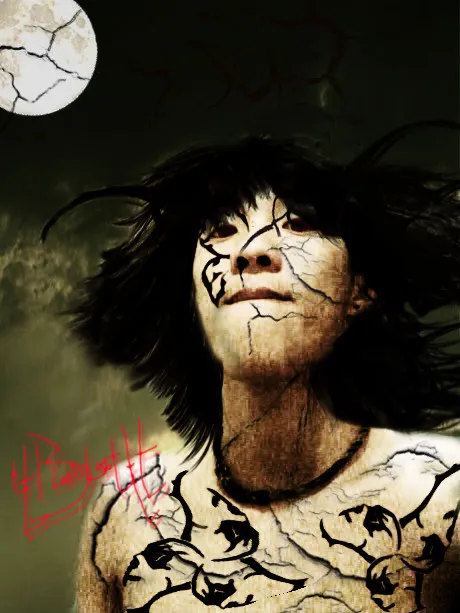 给人物换一个好看的背景 背景的话我就想要你做的那种哥特的风格 然后么把皮肤颜色弄的干净点吧 身上我想弄花纹的线条那种