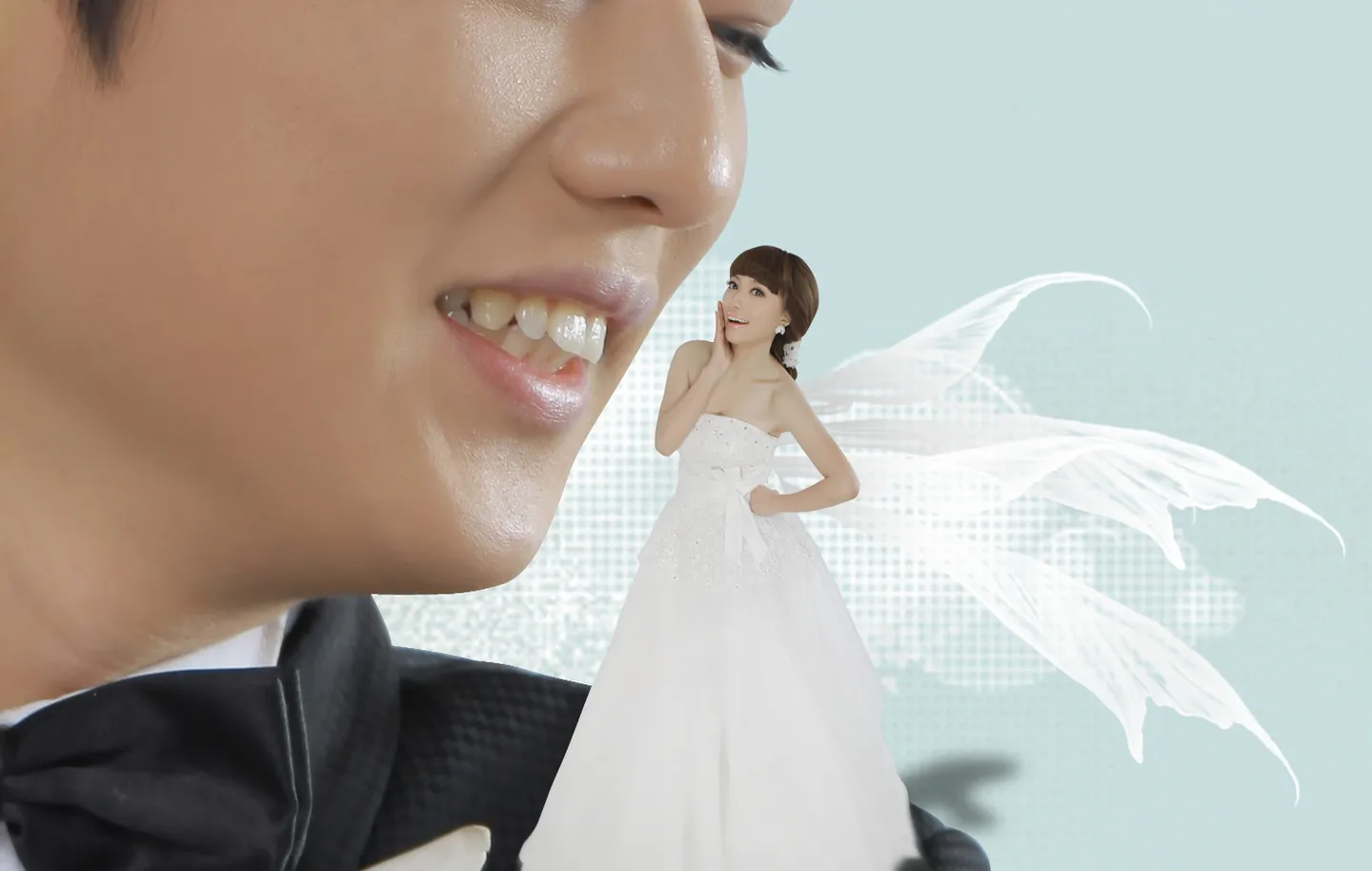 希望和另一张女的照片做成一张图,女的坐在男的肩膀上 给---毁门喵尐瘋