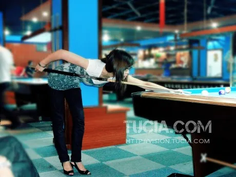呵呵,在这能看到台球美女, 我是斯诺克台球爱好者, 你的姿势不大标准哦· 球杆要在右脚垂直平面上, 脚的方向要与进球方向大概吻合,坐腰要充分下榻~ 这样你打球准度会稳定很多,而且也会更美观,更舒服~