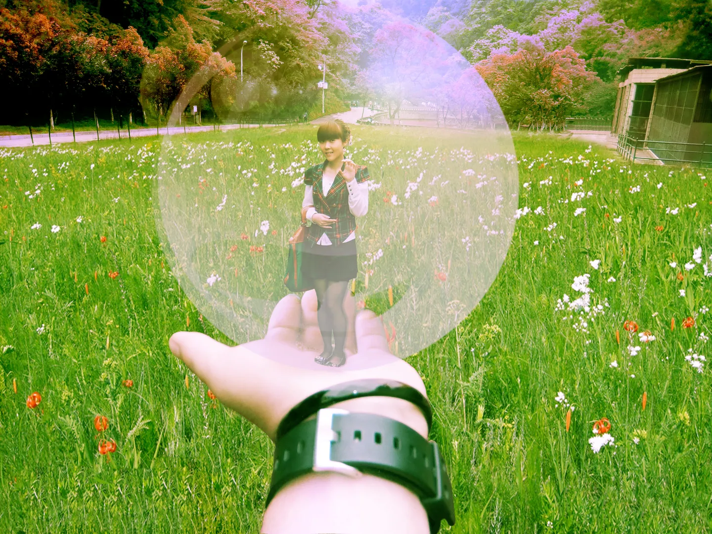 喜欢你的风格,我不知道怎么推你?请帮我抠图,让感觉我就站在他手上一样,然后感觉梦幻些。谢谢,嘻嘻。