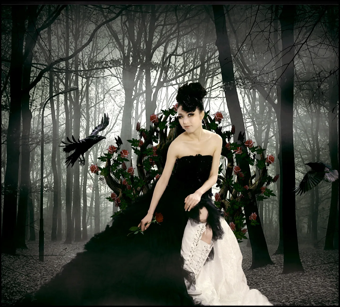 小样 说下我的观点吧 首先 坐着的那个全是玫瑰花的椅子 还有手上的玫瑰花是此图的亮点 玫瑰花 乌鸦 还有黑色的礼服 是比较合理的搭配 手上的玫瑰花 真心好赞 是我最喜欢的地方