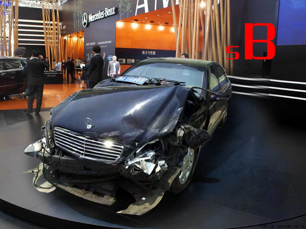 请您突出“奔驰”轿车,把背景换成蓝天(已经在参考图片里),并且写上“b"字母(奔驰的首字母是b),艺术一点,红色,位置就看您认为哪里更好了!谢谢!