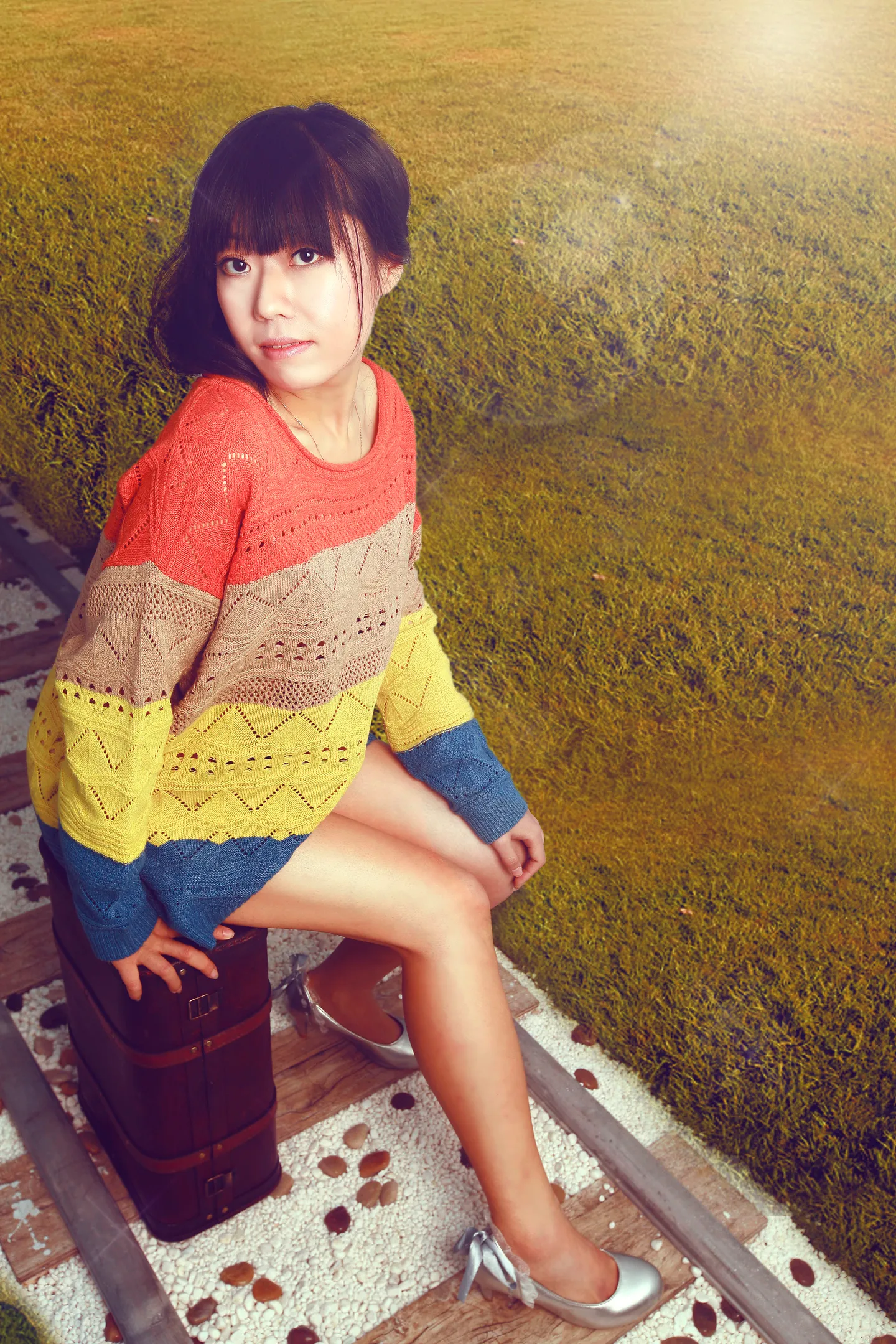这个是跑郊外旅游是吧……铁轨+草地+旅行箱,很有出游的感觉,嘿嘿!
