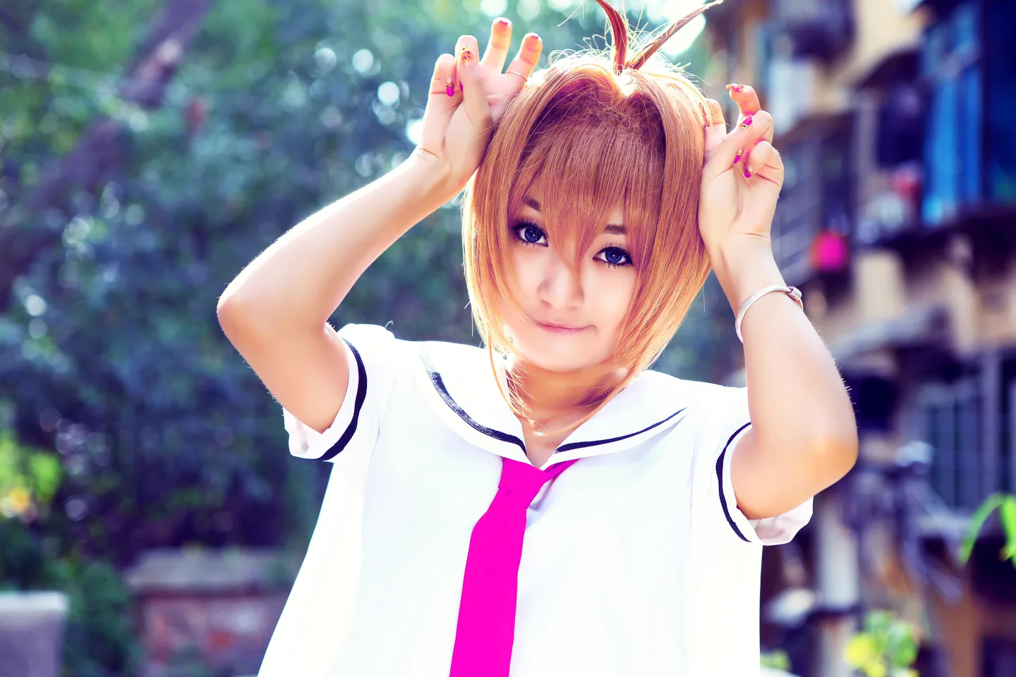 请给我调整个适合的光线, 换一个好看的背景 光影美图请住手。 基调:欢悦明快的