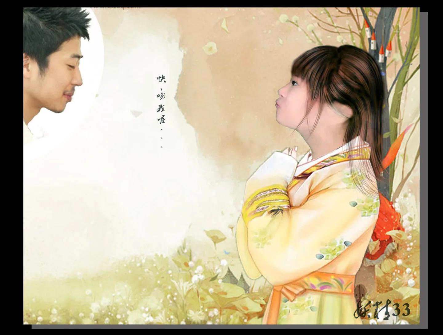 很喜欢亲的风格,冒昧指定,希望能接下 手绘图~~~~~ 大师随意~~ 哦,对。。(最好是能比较像我的,可以认出是我啦,哈哈 我好自恋好自恋啊~~图上手写上“妖精33”)谢谢谢谢!!表拒绝我,,,我慢慢排队呀~么 换一个好看的背景