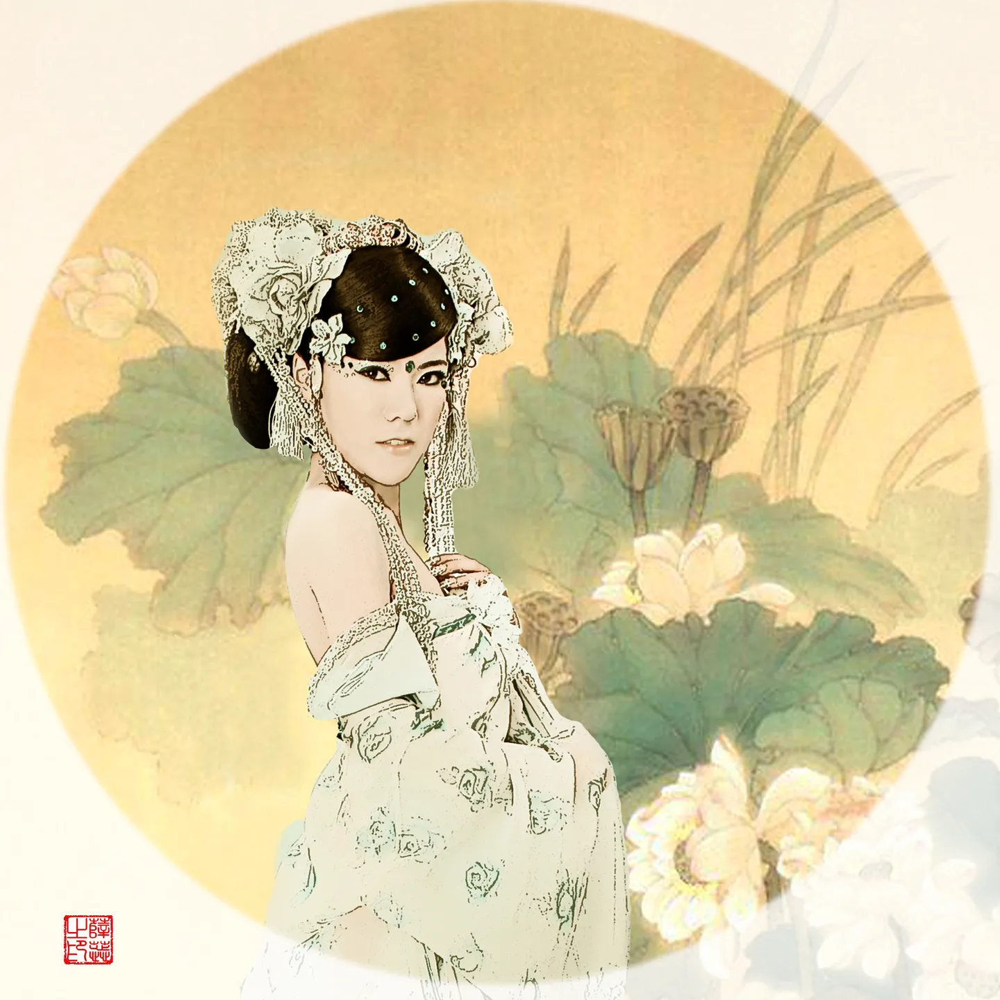 给你点意见,像这种图不需要你再去调色(这种艺术照影楼会先把她弄好色) ,需要的是手绘或者一个更适合的背景,,,