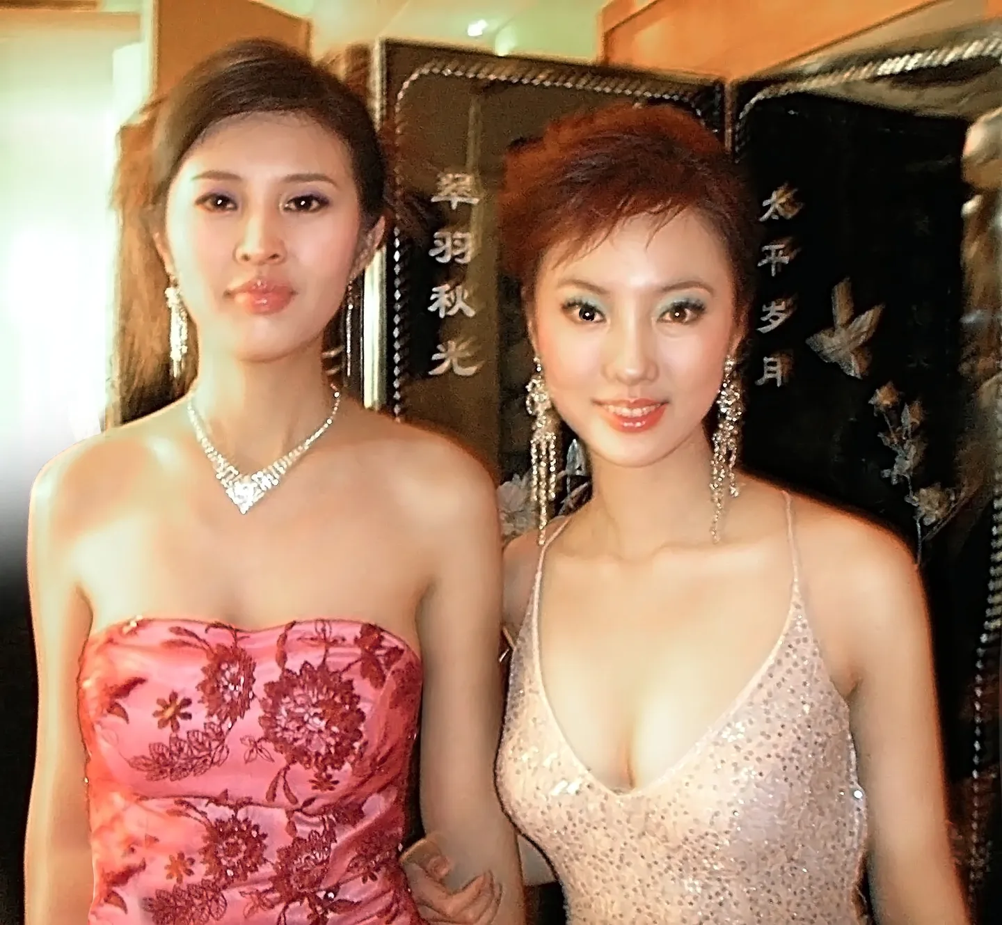 1 影象模糊了,请帮我修好 2 光线调整下,可以适度美化下,后面的闲杂人等去掉,换点好看的背景(屏风最好能保留) 美化右边(银色衣服)人物脸部,右边的人脸稍微修瘦些,手臂旁边的衣服需要修修整齐. 美化左边(红色衣服)人物身材/体型,发型稍修一下.左边的人身上的牌子修掉. 谢谢! 用途:家庭纪念 基调:典雅唯美 艺术化:轻微艺术化