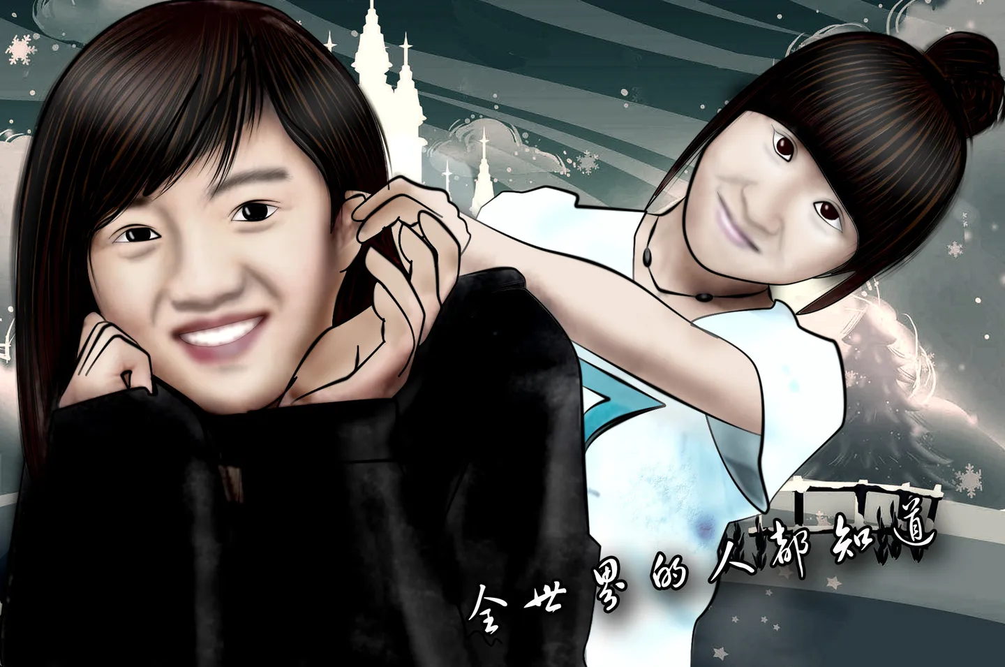 亲的手绘很有特点,很喜欢! 把我们两个做成合照吧,矢量或卡通都可以。 有劳啦!╭(╯3╰)╮ 能加上“全世界的人都知道”这几个字么。