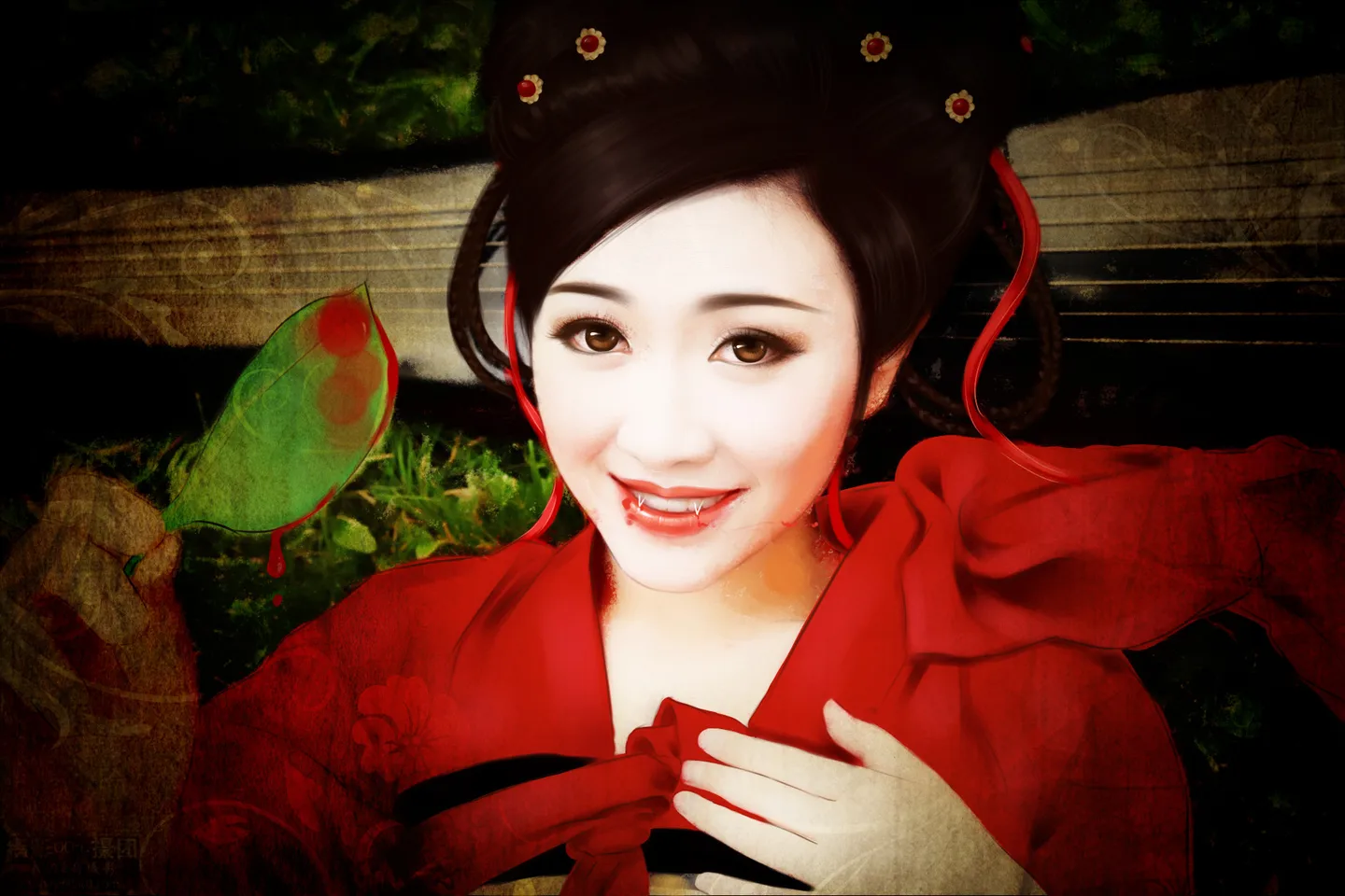 邪恶效果的话,皮肤也太粉嫩了~要弄苍白,发青,瞳色也换下~~头发打散,头枕的乐器什么的换成骨架,另外对着树叶邪笑很奇怪唉。。。嗯,要不换成被害者钱包里染血的照片如何?~~(我去,为什么说到这个会这么多话。。。)