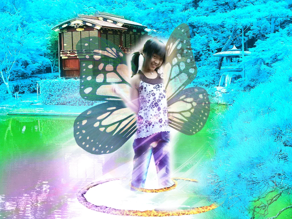 背景换成可爱梦幻的那种 肤色调白嫩一点。 取上身还是全部任您选择。 整体色调是可爱梦幻的。 用途:家庭纪念 基调:欢悦明快的