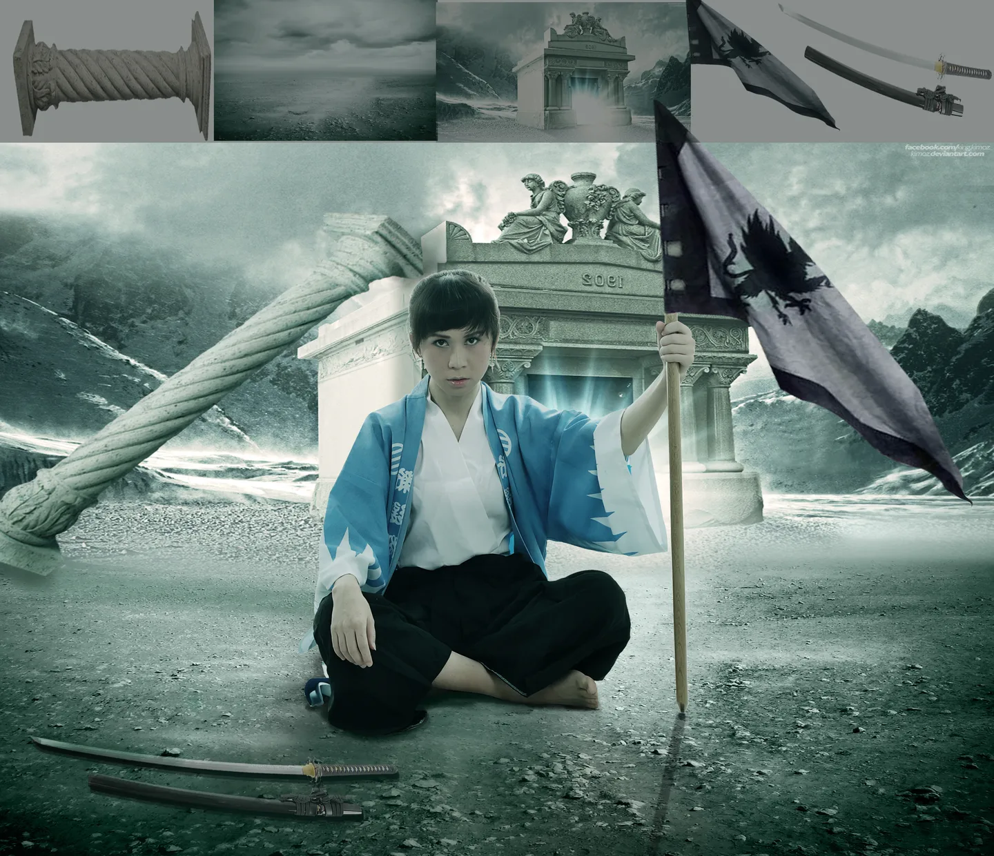 我感覺人物的影子也應該參考旗子的 而且那把日本刀刀柄的部份太亮了 應該暗一點 不過總體效果還是很贊的 (表情)