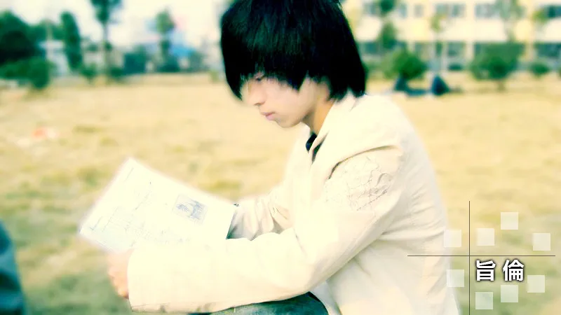 把背景弄得模糊些,人物清晰些,突出人物这个重点,还有弄亮些.再加上"旨倫"这两个字,就这样拉.谢谢!