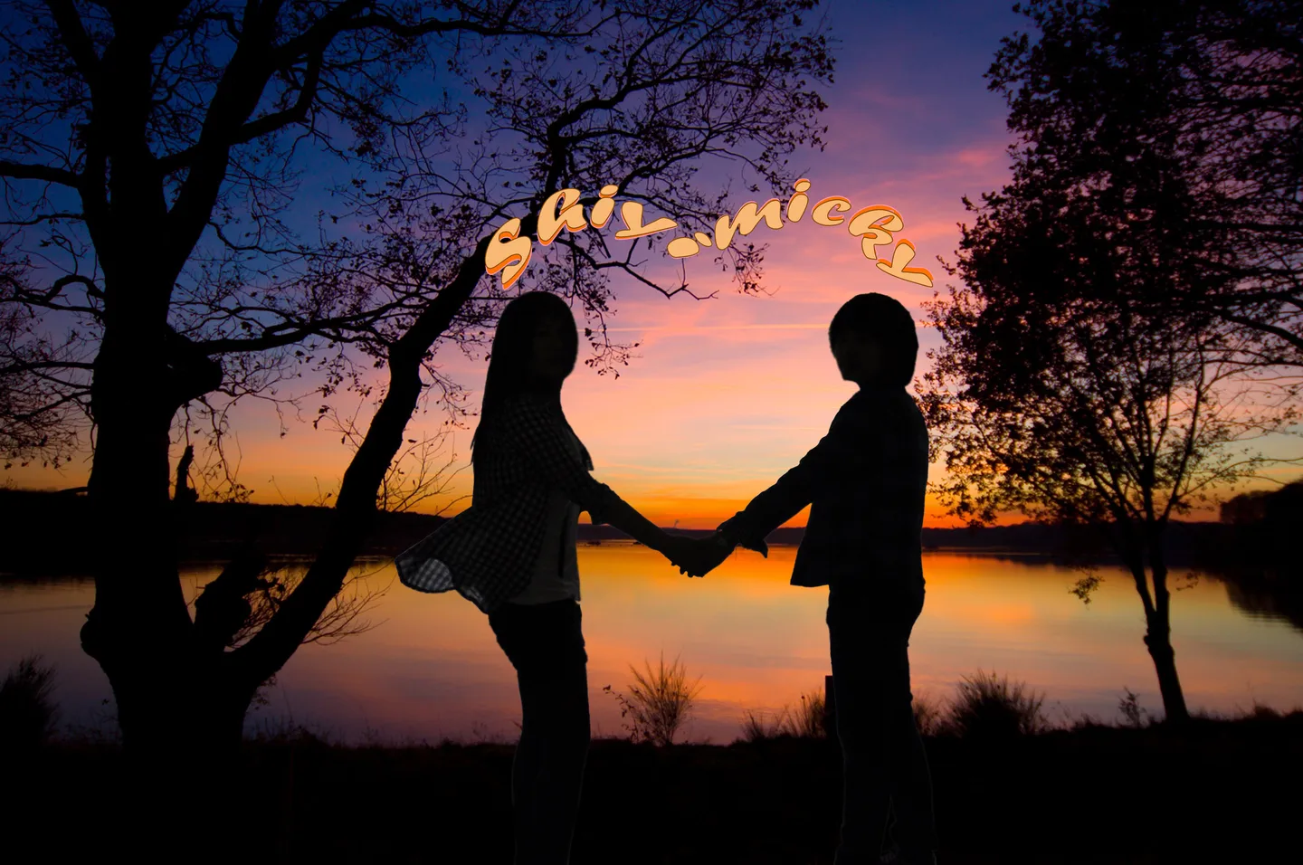 有感觉的大师接~~ 把背景换成好看的夕阳下~~ 弄成剪影啊~~ 左边人物附近标上Shiyi,右边标上micky,字体要好看点啊~~