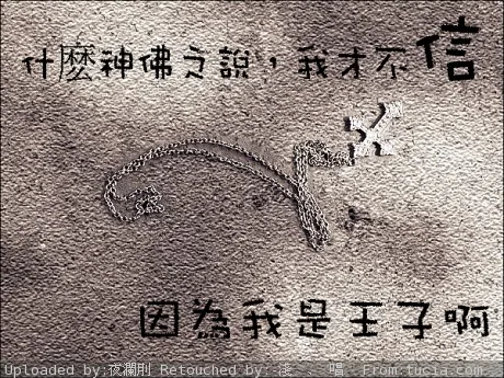 加上兩行字: “什麽神佛之說,我才不信。 因為我是王子啊。” 不要加在一起 加在圖的兩端 其他的就看P圖師的發揮了... 用途:娱乐 基调:严肃冷酷 艺术化:轻微艺术化 背景:稍作调整