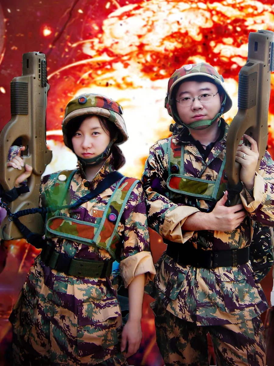 能否把女生改漂亮些,男生改酷些,背景最好换成战争场景,枪能改成真的更好,谢谢了!