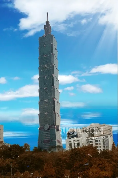 这幅台湾101大楼是在天气不好时拍的,并且顶部天线不完整。 请清晰化并表现细节,完整它的天线部分,以恢复它的雄姿。
