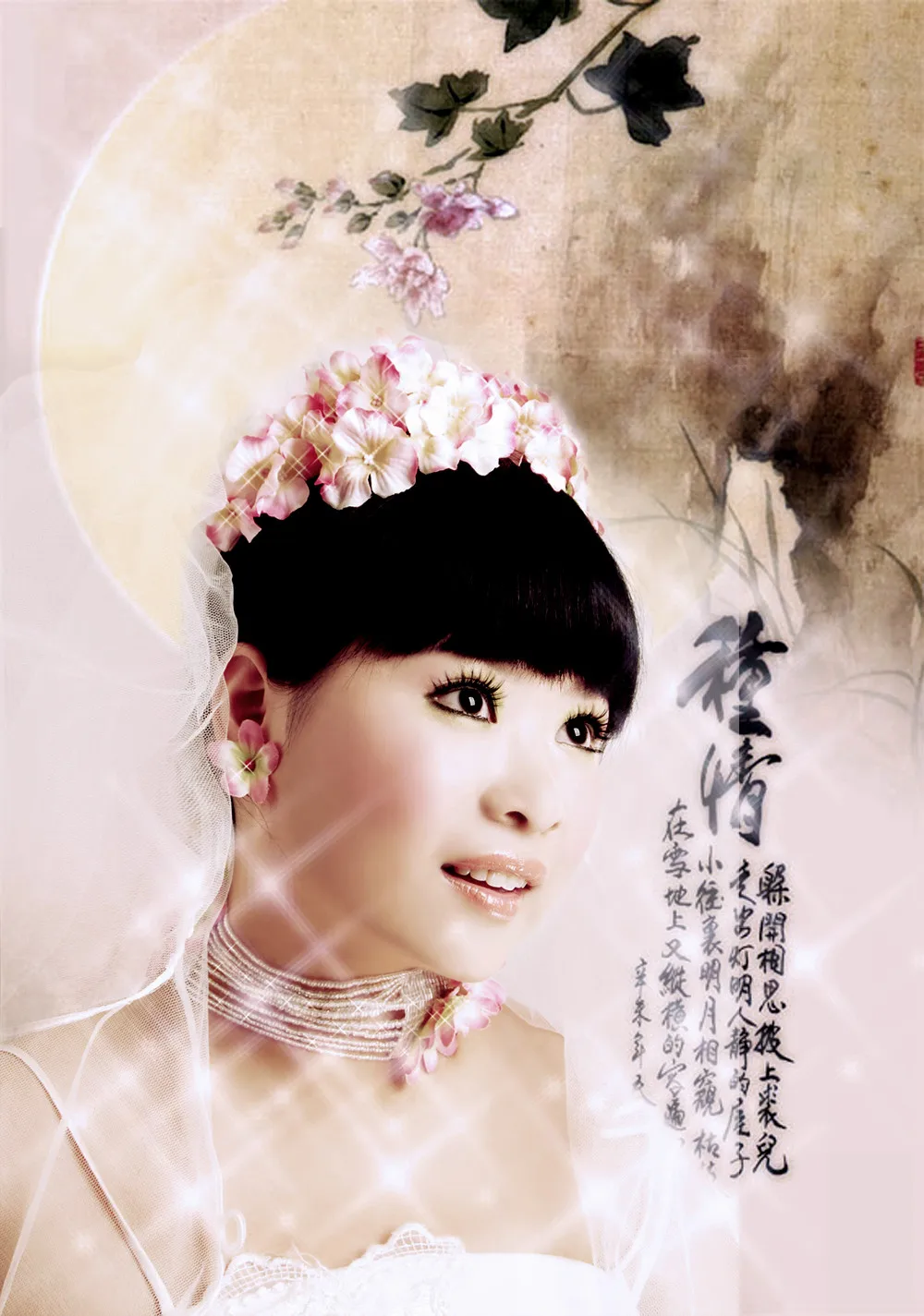 基调:典雅唯美 背景和婚纱的色彩相近,然后色彩也是比较淡的,所以不知道该如何处理!色调和背景可根据设计师的创意随意修改,好看为目的,请高手帮忙(急需),感激不尽!