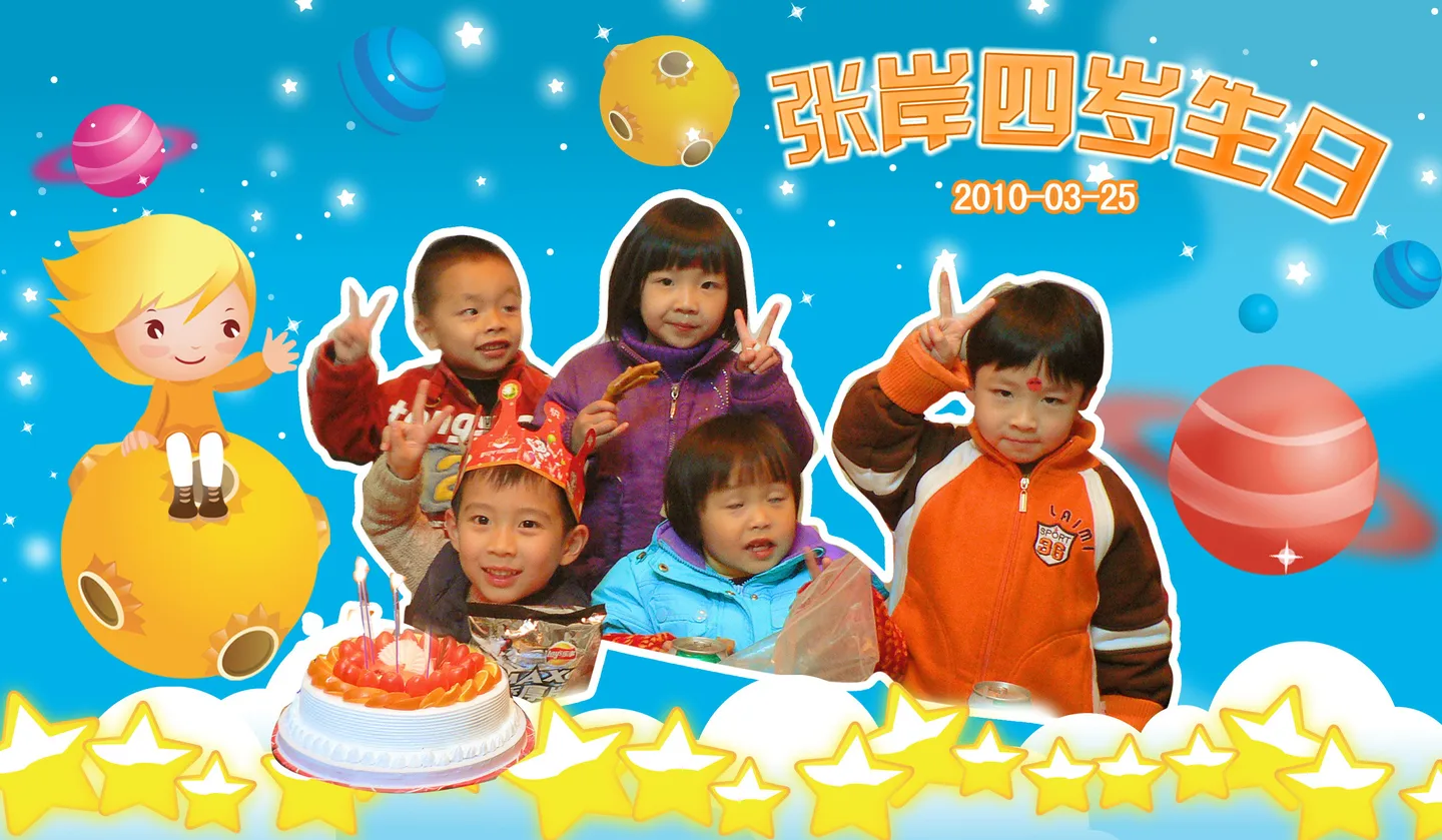 换一个好看的背景 用途:家庭纪念 基调:欢悦明快的 艺术化:轻微艺术化 尊敬的烘培师,如果您有空,且对这张图感兴趣,能否帮我1、把背景处理一下,突出童趣即可。或者使这张照片看起来是在草地、游乐场、太空飞船上举行的生日会什么的。2、把“张岸四岁生日”这几个字加在您认为合适的地方(字体卡通化)。3、把“20100325”这几个数字加在您认为合适的任意地方。4、把最右边的红色衣服的大人去掉。在下先行谢过!