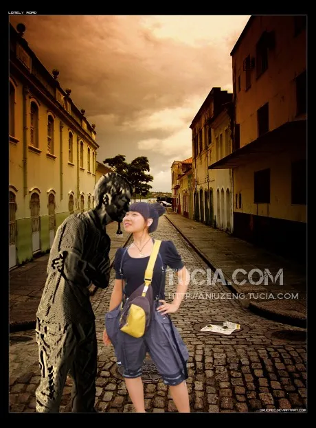 指定:我在马路边. 男生做成铜像,女生保留原样, 背景:按风格和创意变换吧! 其他随意.有劳了!谢谢.