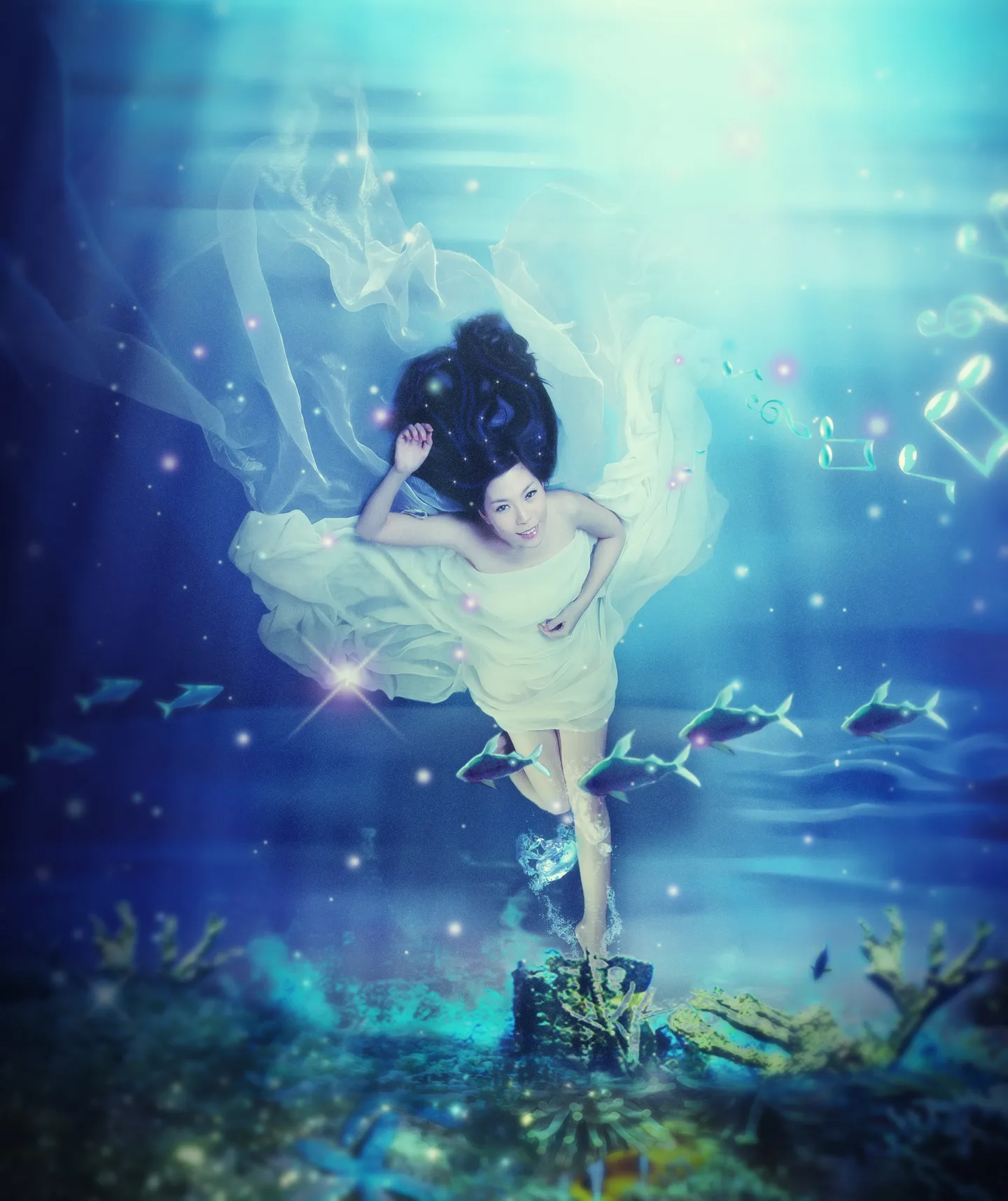 这个水下很自然,裙摆头发都感觉随波飘,呵呵。很好看啊 ,如果加上气泡会不会更形象呢……推推推