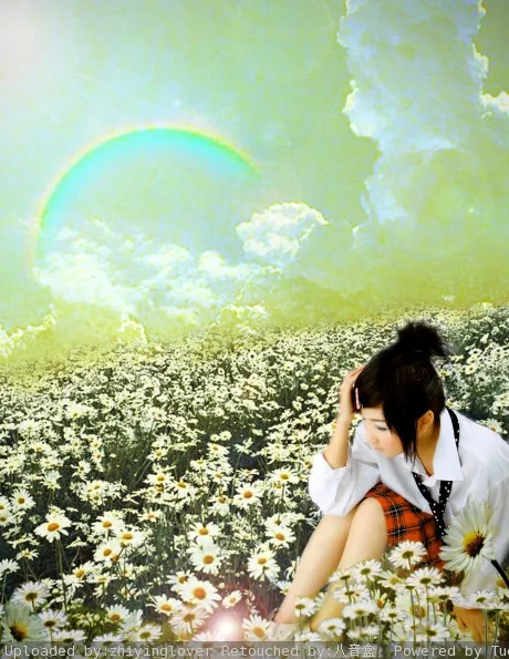 给人物换一个好看的背景 要唯美的感觉,那种坐在一片雏菊花海里的意境。保持真实性就好了! 谢谢!
