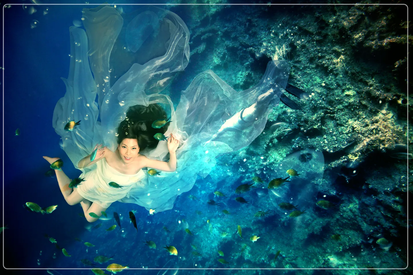 真好看,这张的纱融的更好了,更飘逸逼真了 但是小页,我好像看到了潜水员的小腿和脚上穿的噗噗~ (表情)