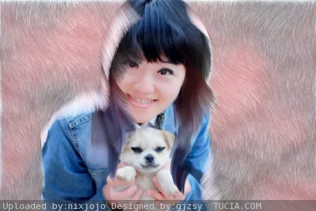 把脸上的瑕疵去掉,眼睛变大些。小狗表情变高兴。旁边可以来点装饰。谢谢。