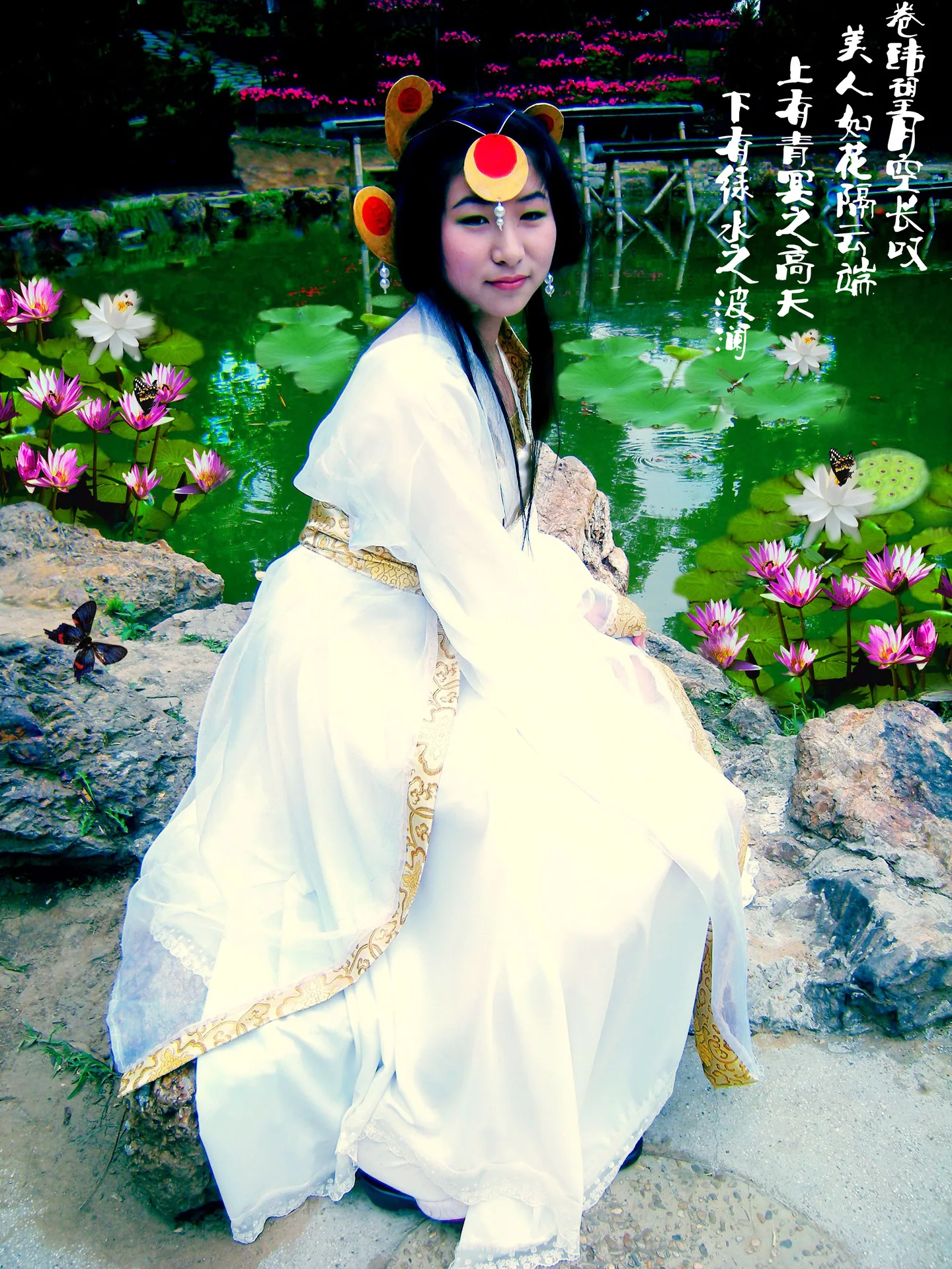 把背景里的“人影”都处理掉吧~还有水面的效果,希望可以处理成墨绿色的~(漂亮一点滴墨绿色啊~)最好水面上可以加上莲花什么滴~(是长安幻夜滴cos,可是瑟瑟没有什么参考图呀,囧……) 用途:cosplay 基调:典雅唯美,古风…… 背景:稍作调整