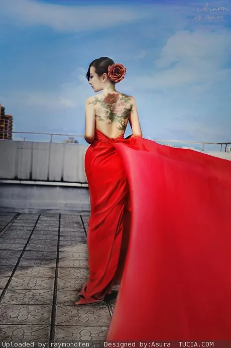 在背部的皮肤上P上些许彩绘纹身噢,天空P成蔚蓝色,蓝天白云的感觉,天台地板的颜色P深点,有感觉的来P吧. 艺术化:保持真实性 艺术化:深度艺术化