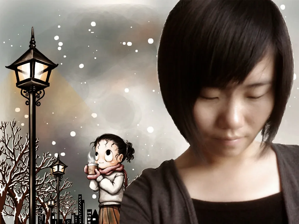 美化人物脸部, 把刘海那的一小撮长的头发去掉, 给人物换一个好看的背景 最好是可爱的卡通造型的 艺术化:深度艺术化