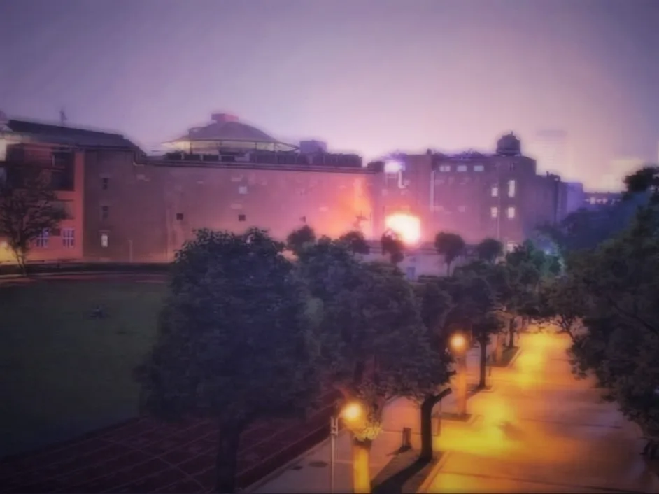 某蓝把介这片片的主题定义为:傍晚蒙蒙细雨下的校园~