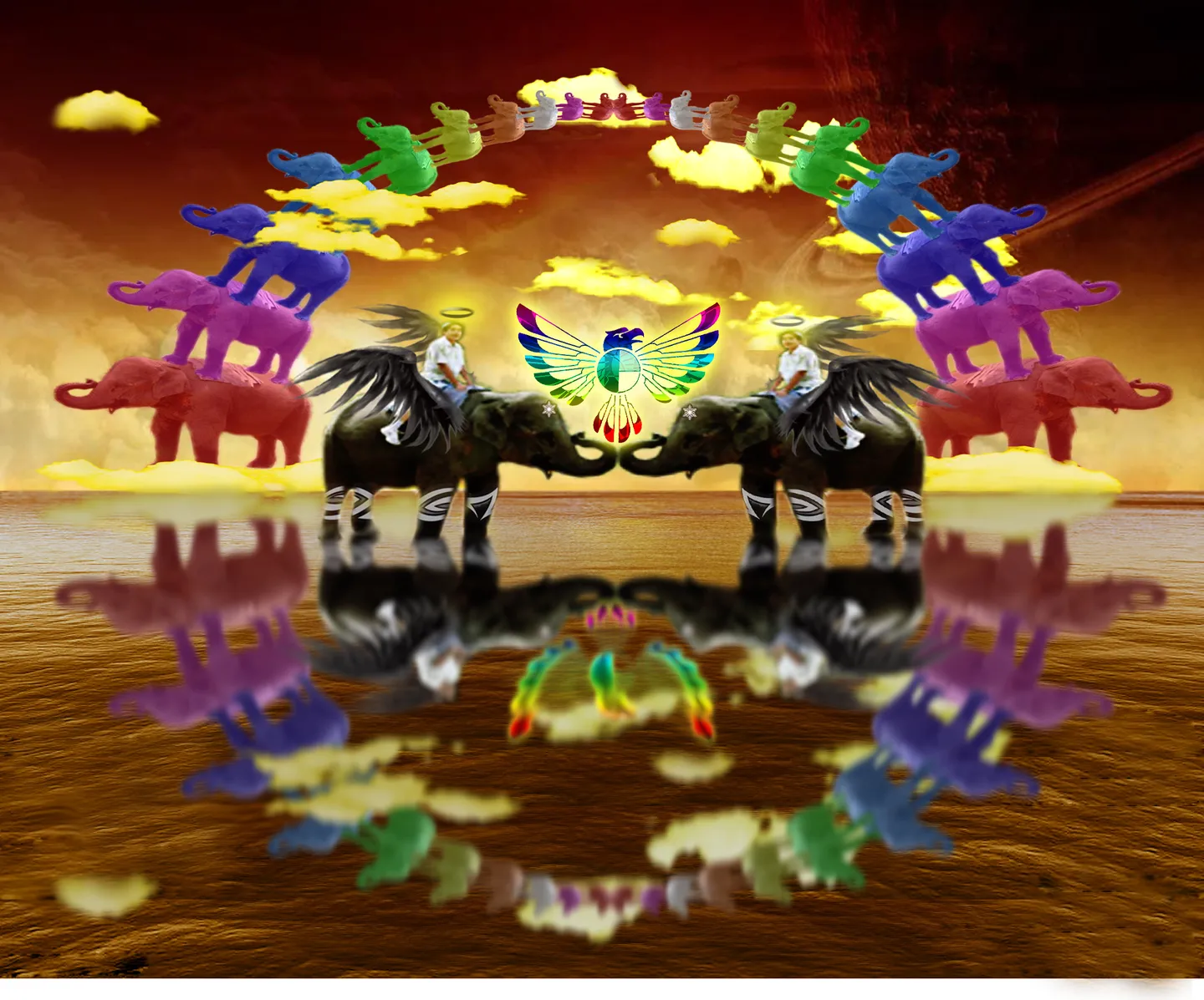 世尊骑六牙玄象,如来踏莲花祥云,阳乌载日,法轮常转