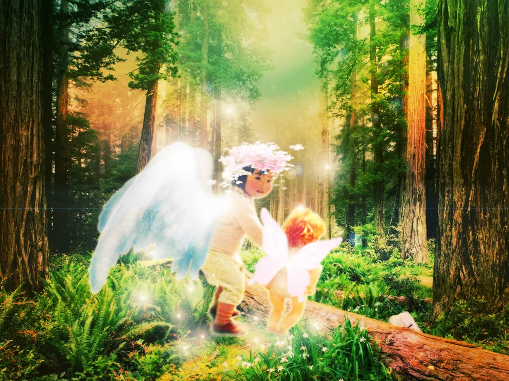 这是张老照片,想让照片看上去焕然一新,人物和娃娃不要换掉,加上翅膀,草帽能换掉最好,可以是仙境或者海边什么的,谢谢