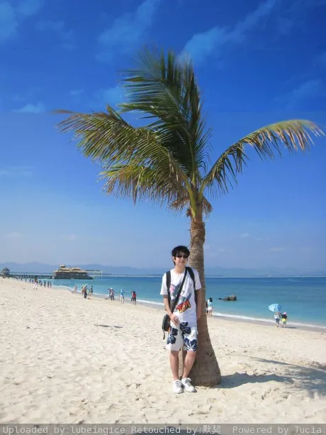请设计师帮我把旁边那个大妈去掉,最好在天上加上好看的云朵,处理得像艺术照片一样。人呢,再弄得帅一点,头发好像有点散乱。。。