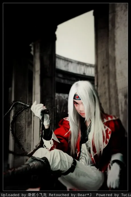 大师这次来个黑暗邪恶风格的吧...把衣服换一下,放到个大点的背景里去,发型也换下吧....然后脸上可以多点纹身什么的!恶魔化...哈哈.... 基调:严肃冷酷
