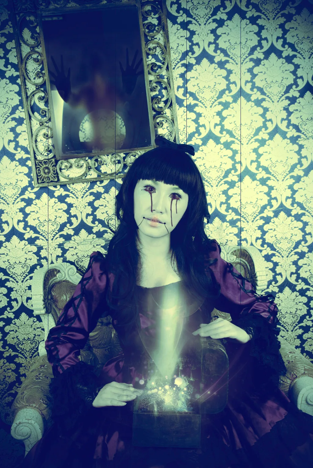 亲啊,我想要你那种眼乌子出血的鬼气十足的PP。。。 背后的镜子里呢,最好再合成点诡异的东西。。。中世纪哥特式的吓人中也要带点可爱。。。 哈哈,要大图,谢谢。。。
