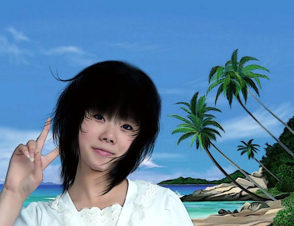 把后面的那个手去掉,我想要一个齐齐的刘海,到肩膀那么长的头发,背景换掉,其它的自由发挥了 用途:娱乐 基调:欢悦明快的 艺术化:轻微艺术化