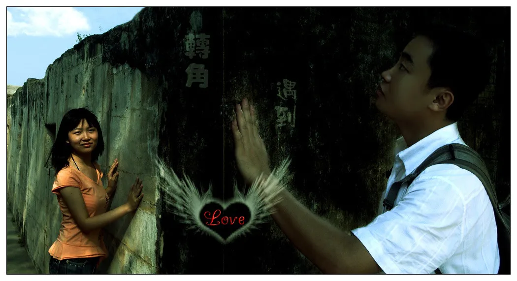 我希望能把两张图片拼成一张,意为“转角遇上爱”,当然,墙面得一致啦,透视得协调啦,其他就看大师的感觉了,希望大师能给我满意的效果,谢谢!!!