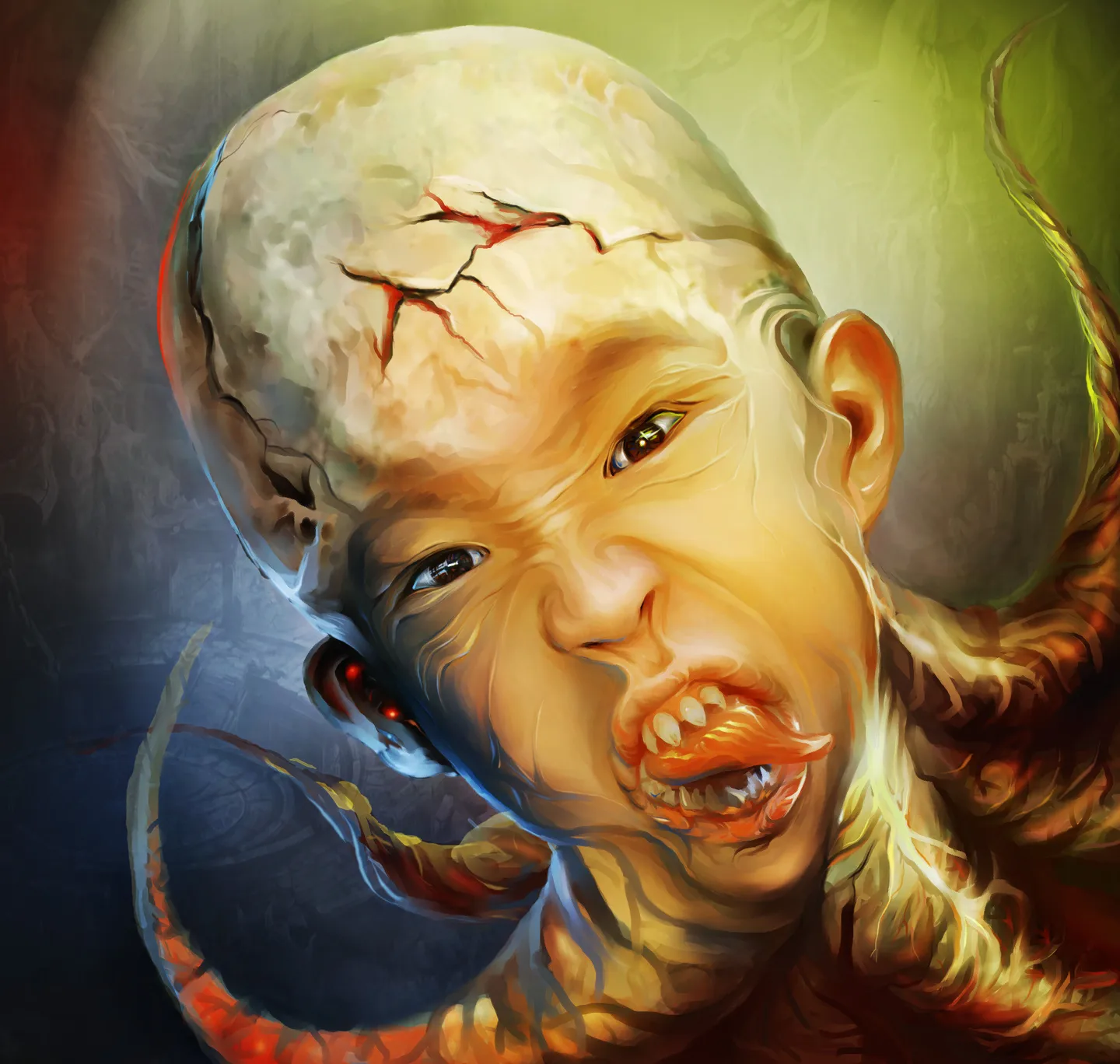 头部是骨,面部是皮,颜色和质感都不同,另外,本图有红黄蓝三个光源,面部在红色光源区多一些。