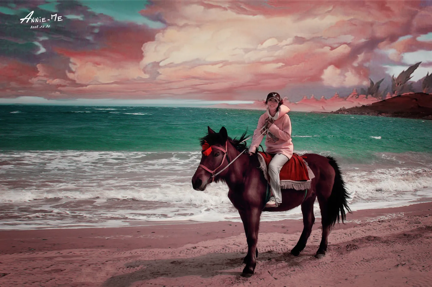 亲爱哒~~安妮唯一一张骑马的图图~帮忙做的唯美点吧!!!海风吹的头发好乱,脸也看不太清,~还有不知道能不能换骑马装~亲爱哒试一下吧。。。期待~~谢谢! 艺术化:轻微艺术化