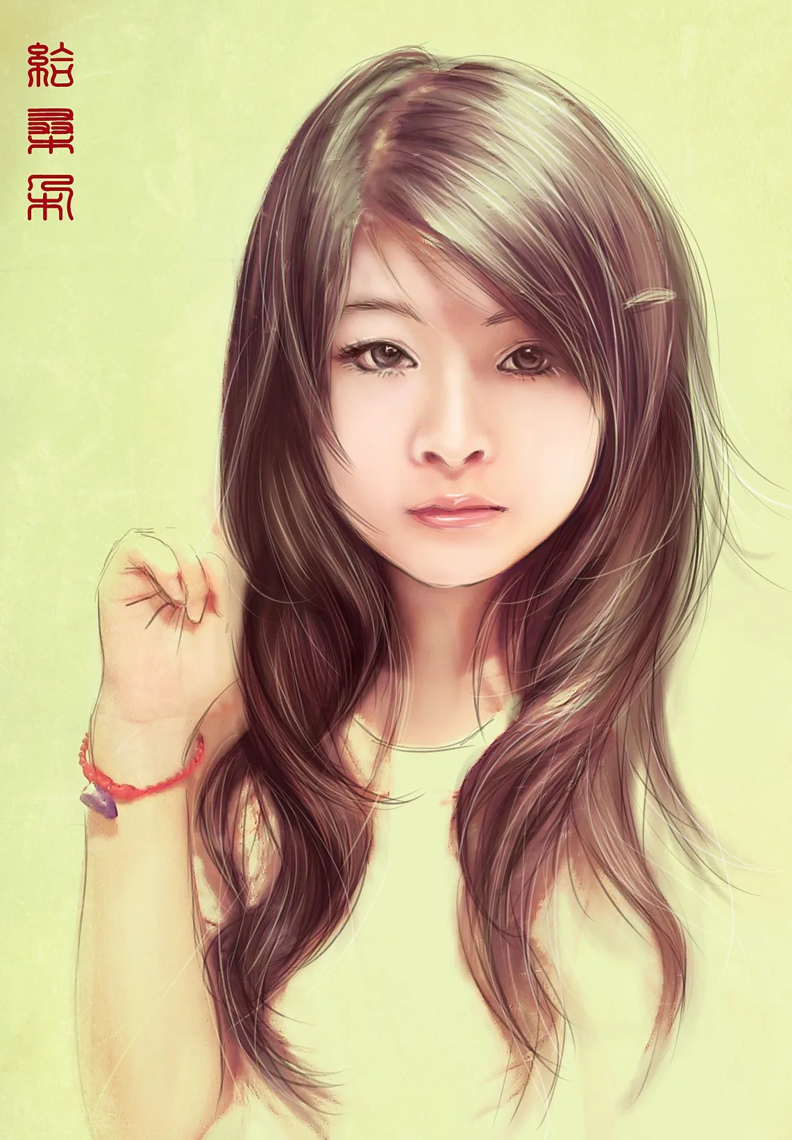 首先 这个不是鼠标画的 是板子,仿手绘 但是还是要把头发眼睛画一边、遍……脸部阴影是原图的……俺只是调色涂抹了下