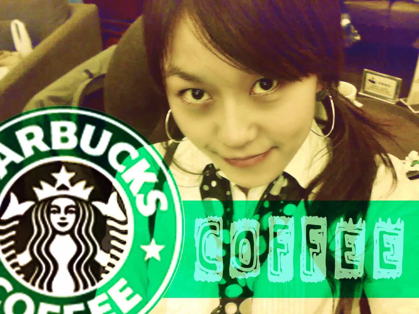 我又来了!嘿嘿!麻烦,光线阿颜色阿弄得自然点。有一点小要求就是,这张是在星巴克拍的,所以能不能在旁边加上“starbucks”和小咖啡杯之类的图案呢~~~总之还是要可爱些的感觉!谢谢啦!