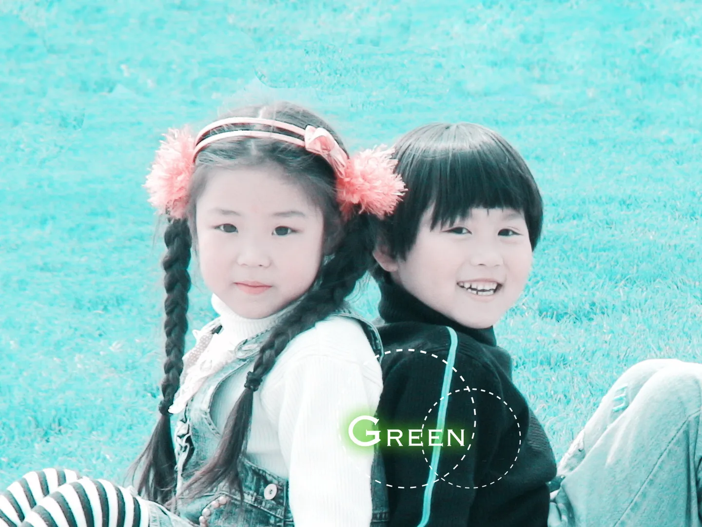 把人物放在中央.可以加点小东西.左边的小女孩眼睛大一点,自然点.让整体不要太空旷.谢谢您了! 基调:欢悦明快的 用途:家庭纪念 背景:稍作调整