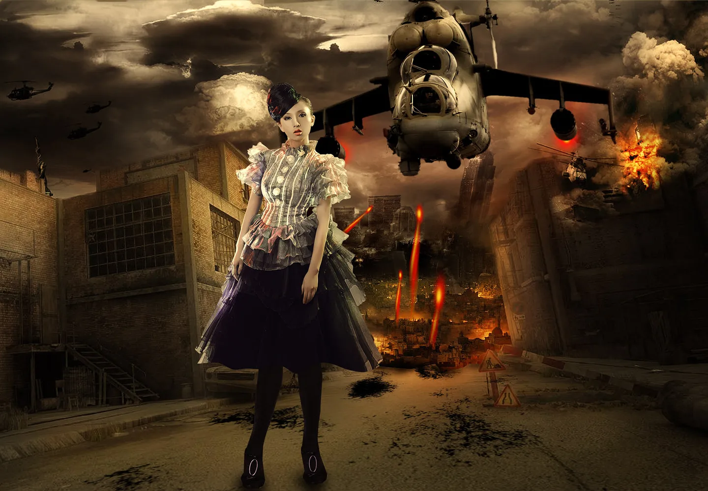 后面要一个夜晚的城市,加上直升机素材,黑底,用夜空突出人物